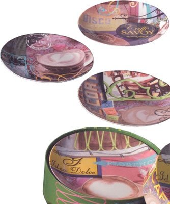 Designed in a contemporary rimless coupe style, the four eight-inch dessert plates in this set each displays a different collage of eye-catching designs that transports the espresso lover to Italy. The plates are completely covered with color, predominantly coffee-brown with accents in turquoise, pink, and lime green. Caffe Italia plates serve everything from croissants with morning lattes to slices of chocolate cake or pie for after-dinner dessert, and stand up to everyday use in the microwave and dishwasher. The set comes ready for giving in a round gift box, as brightly patterned as the plates themselves. --Ann Bieri